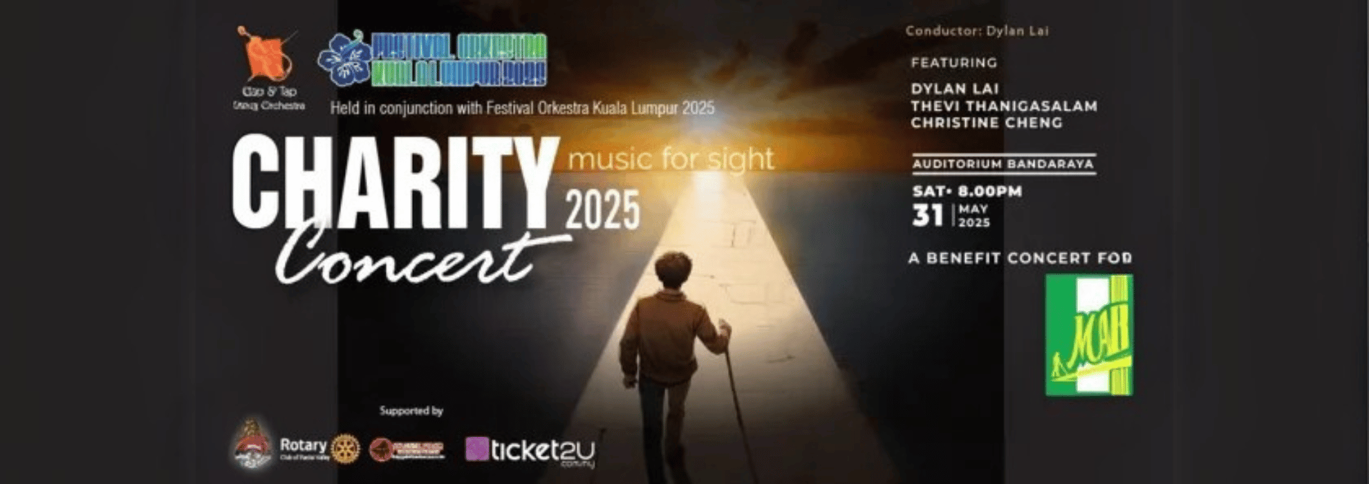 Join the Music For Sight Charity Concert, a standout event of the Festival Orkestra Kuala Lumpur 2025, happening at Auditorium Dewan Bandaraya on 31 May 2025 at 8:00 PM. Organized by the CNT (Clap & Tap Society), this charity concert is held in support of the Malaysian Association for the Blind. The evening will be conducted by Dylan Lai and features captivating performances by Sirra Orchestra, Chip & Tap, guest artists Thevi Thanigasalam and Christine Cheng, as well as a special appearance by a renowned Croatian singer.